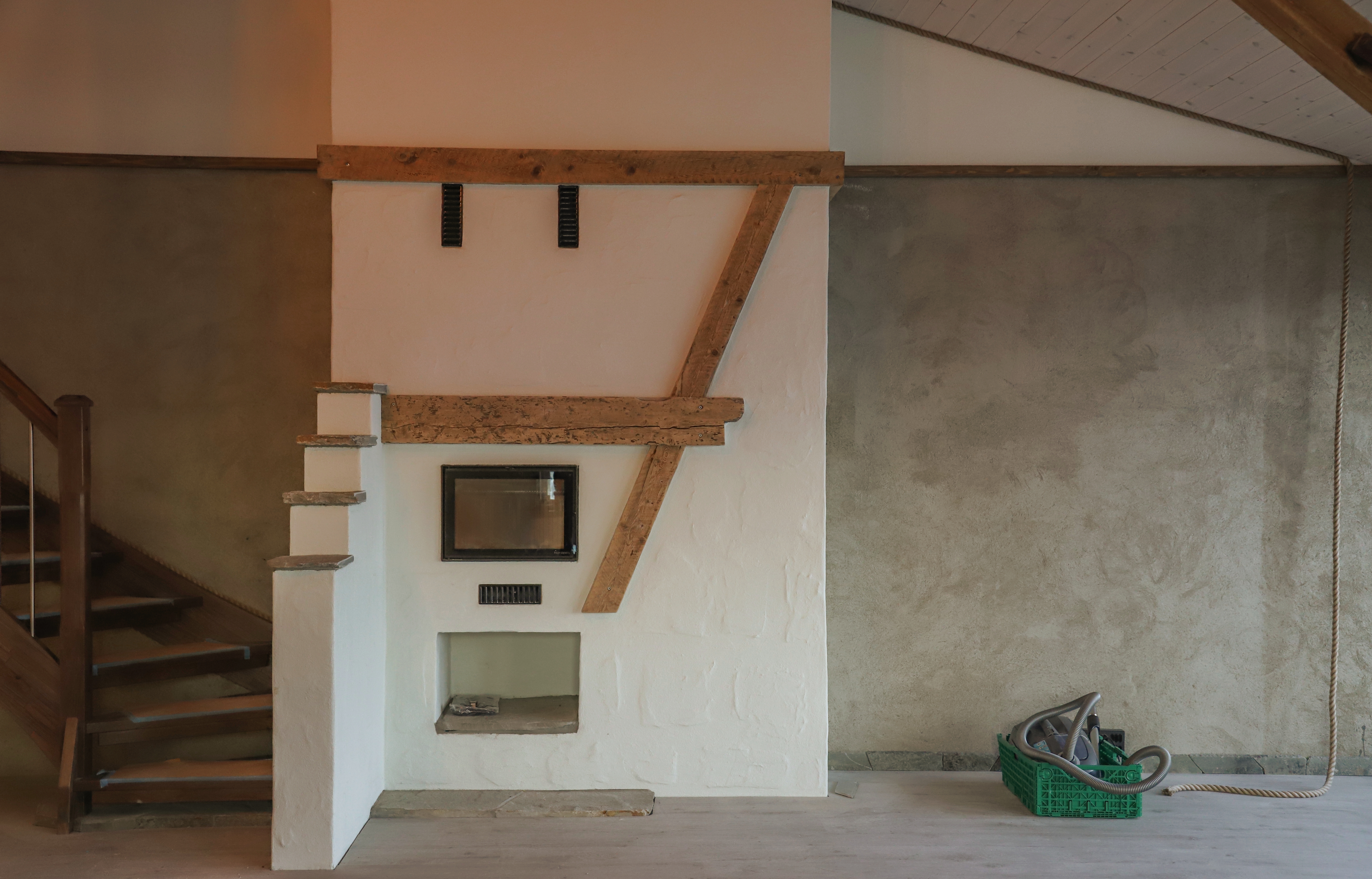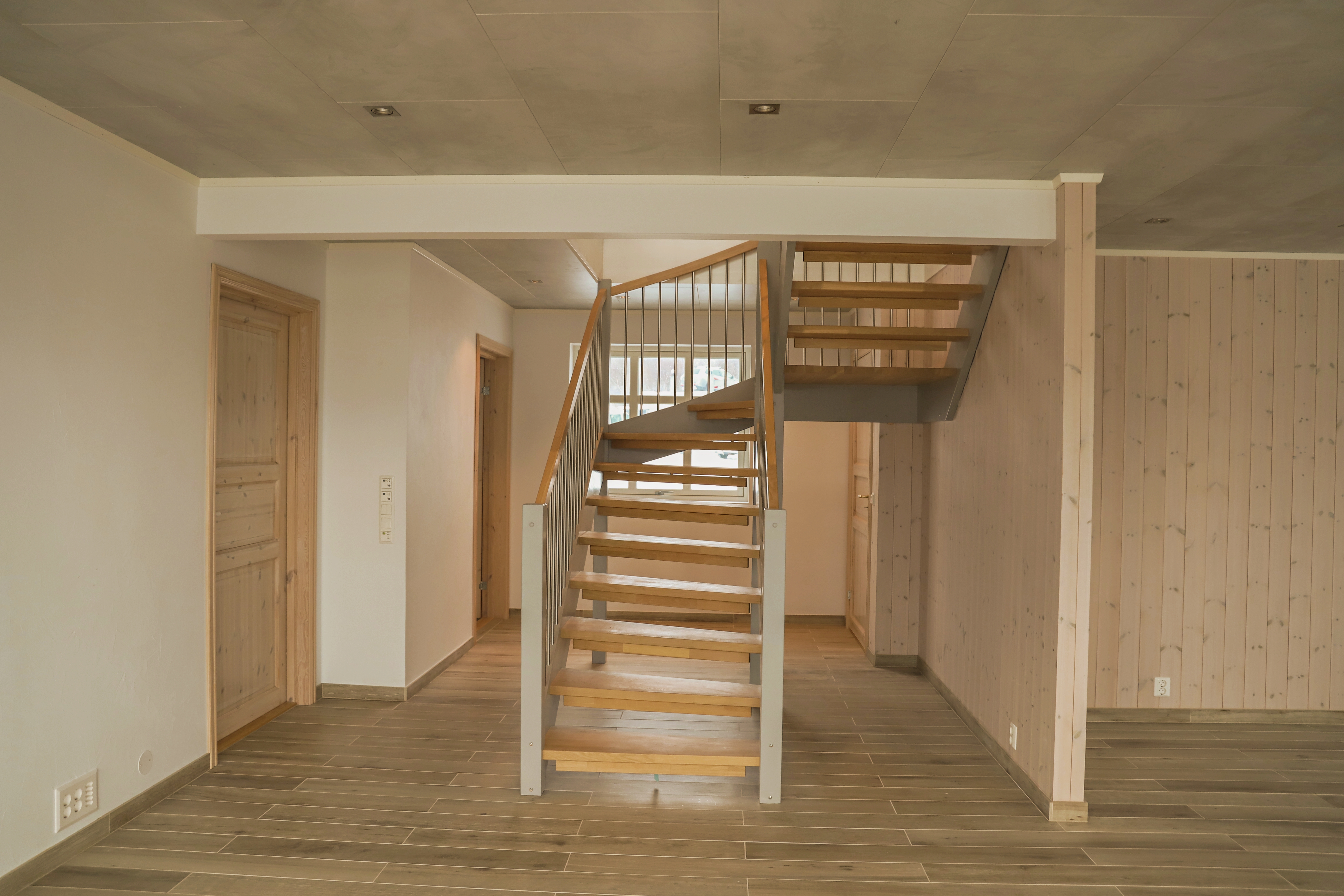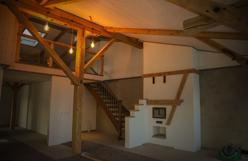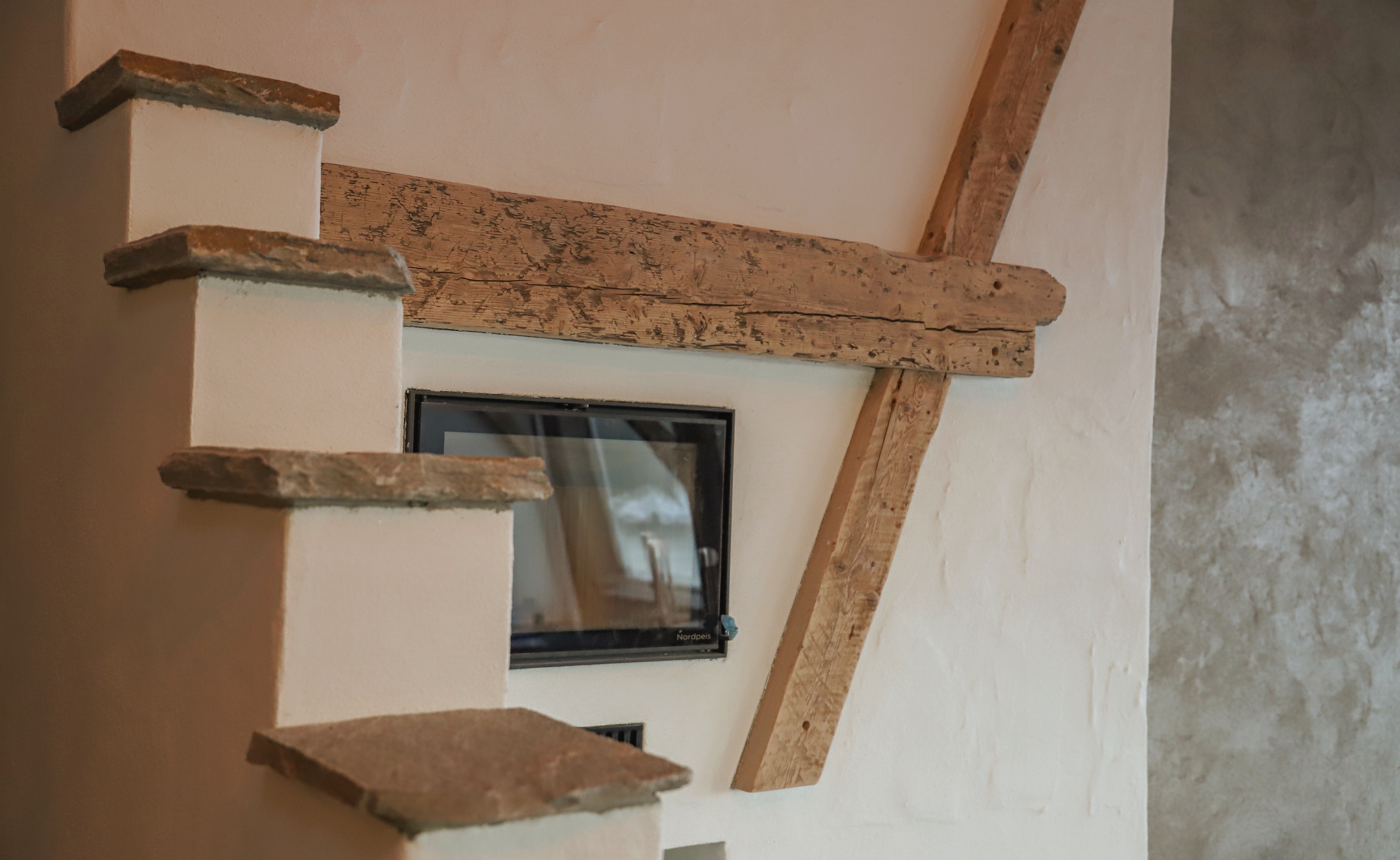 Leilighetene som bygges går over to plan. De gamle bærebjelkene er bevart, det gir leilighetene et stilig og unikt utseende.